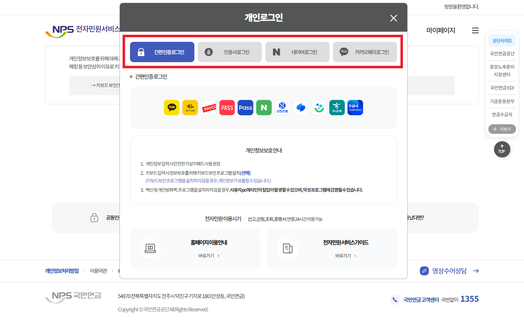 아래 국민연금공단 홈페이지를 예시로 보겠습니다.