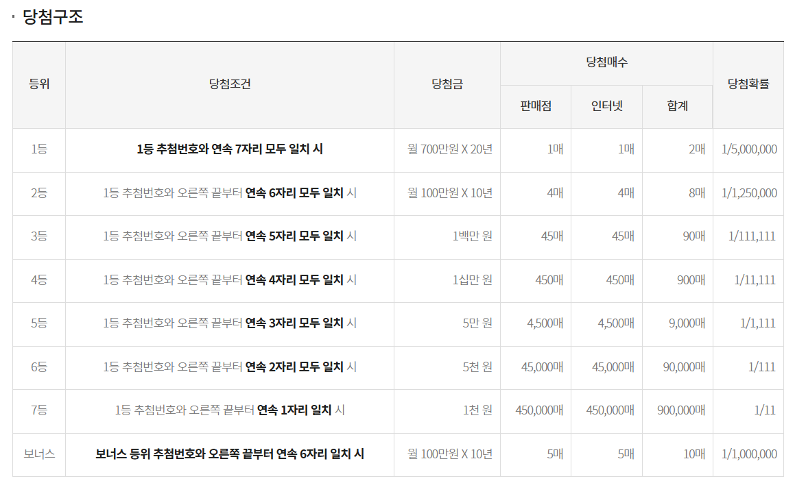 - ✔ 1등: 700만 원 × 20년