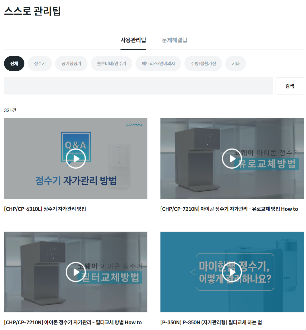 동영상을 보고 직접 관리해 보세요. 시간도 아끼고 돈도 아끼며 간단한 기술도 배울 수 있는 1석 3조 방법입니다. 정수기 필터 교체나 재품 조작 방법 등은 추후에도 계속 작성해줘야 하는 부분인 만큼 미리 경험해 두면 도움 되리라 생각됩니다. 코웨이 제품 설명서가 필요하시면 여기로 이동하세요.