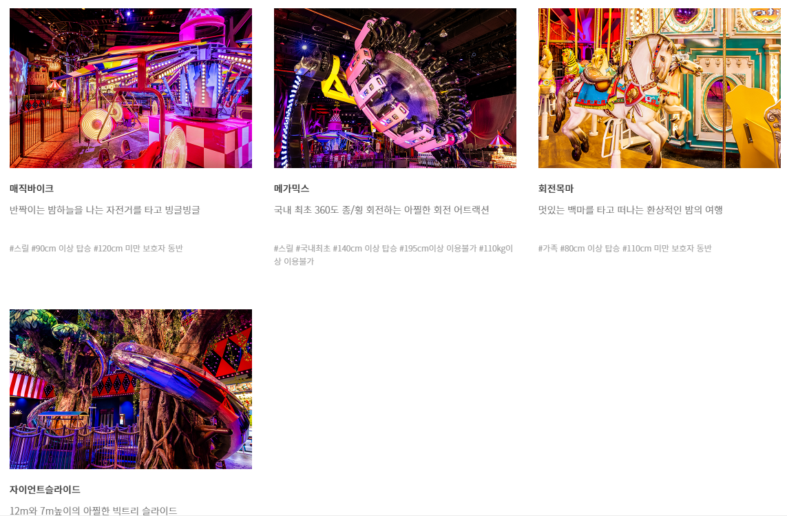 | 1 | 회 전 목 마 | 80cm 이상 탑승, 110cm 미만 보호자 동반 탑승 |