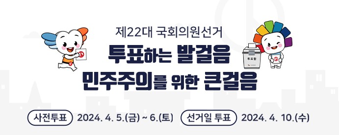 투표하는 발걸음은 민주주의를 위한 큰 걸음입니다. 4월 10일 잊지 말고 투표하러 갑시다. 오늘은 선거일정과 사전투표소 확인하는 시간을 가져보겠습니다.