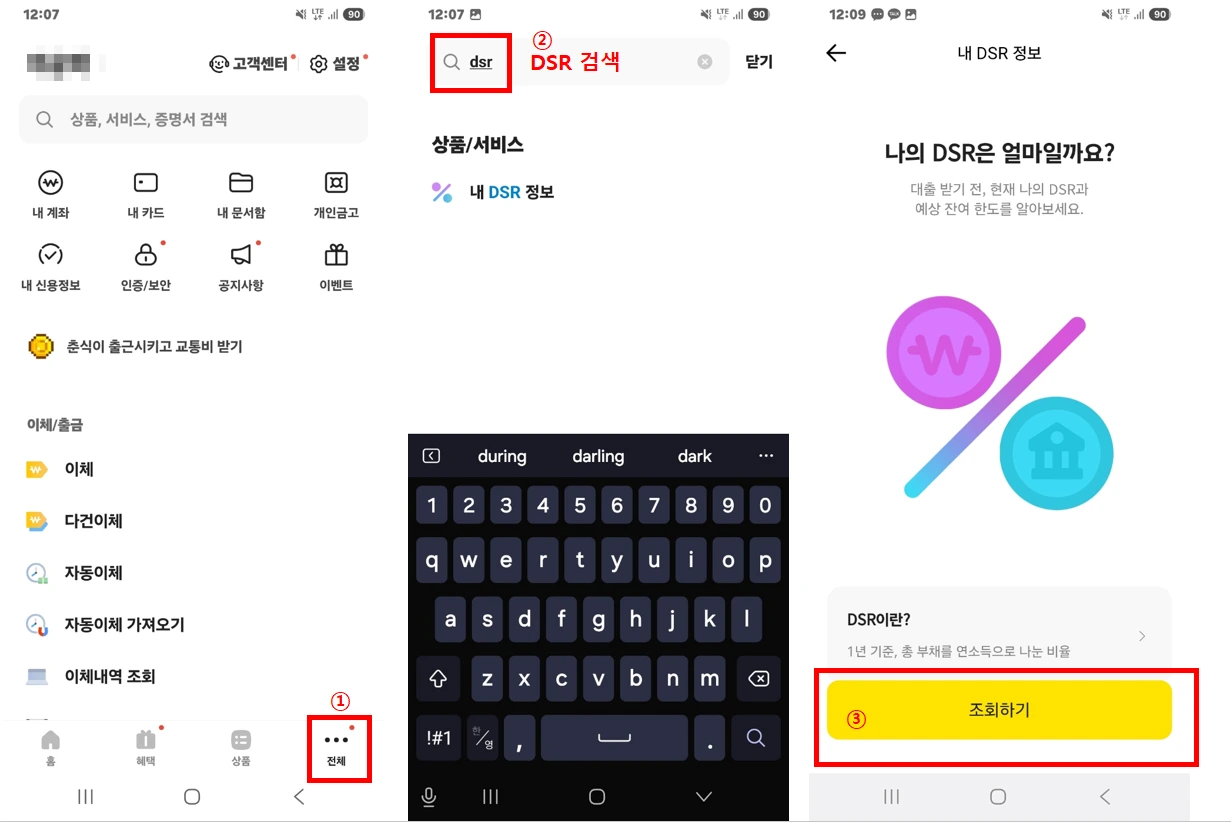 ① 앱 실행 후 하단 [전체] 메뉴 → 상단 검색창에 ‘DSR’ 입력