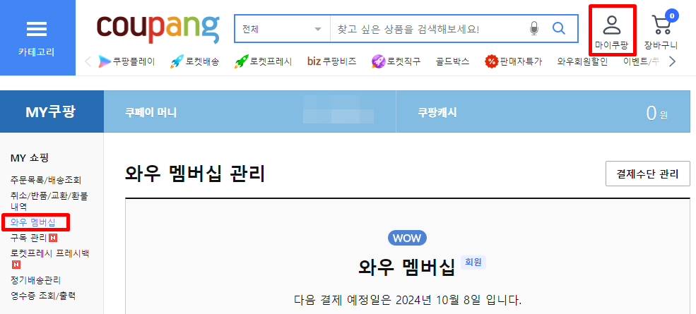 2. PC에서 쿠팡 로켓와우 멤버십 해지하는 방법