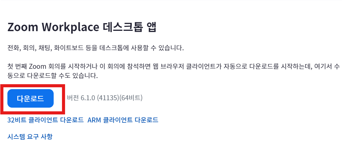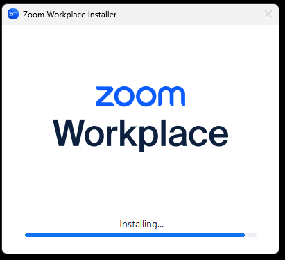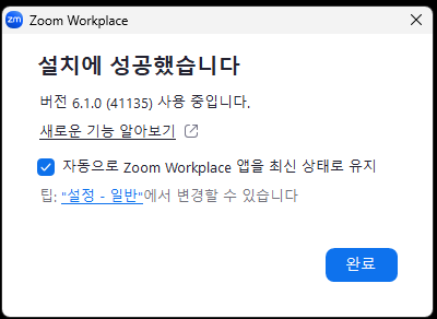 2. 내려받은 파일을 더블클릭해 자동설치를 시작합니다. 설치과정을 따르시면 "설치에 성공했습니다"라는 메시지와 함께 설치가 완료됩니다. 이후 Zoom Workplace 창을 확인할 수 있습니다.
